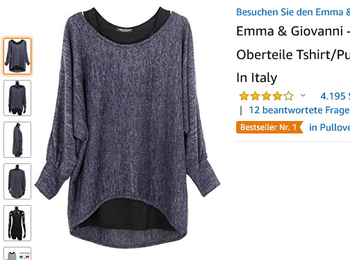Frau bekommt zwei Kleidungsstücke, ein Tank-Top und ein Loose-Fit-Top für drüber, für den berühmten schmalen Taler. Das liest sich vielleicht seltsam, kommt in der Praxis aber gut an. Die Kombination aus Shirt und Pullover ist der derzeitige Bestseller im Amazon.de-Bereich der Pullover für Damen.